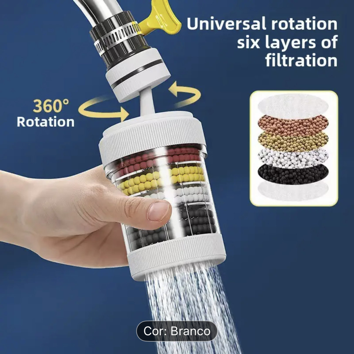 Purificador de Torneira com Filtro de Água de 6 Camadas e Rotação de 360° - Dispensador de Água Universal para Cozinha e Casa de Banho, Reduz o Desperdício de Água, Fácil de Instalar, Sistema de Filtragem Multicamadas